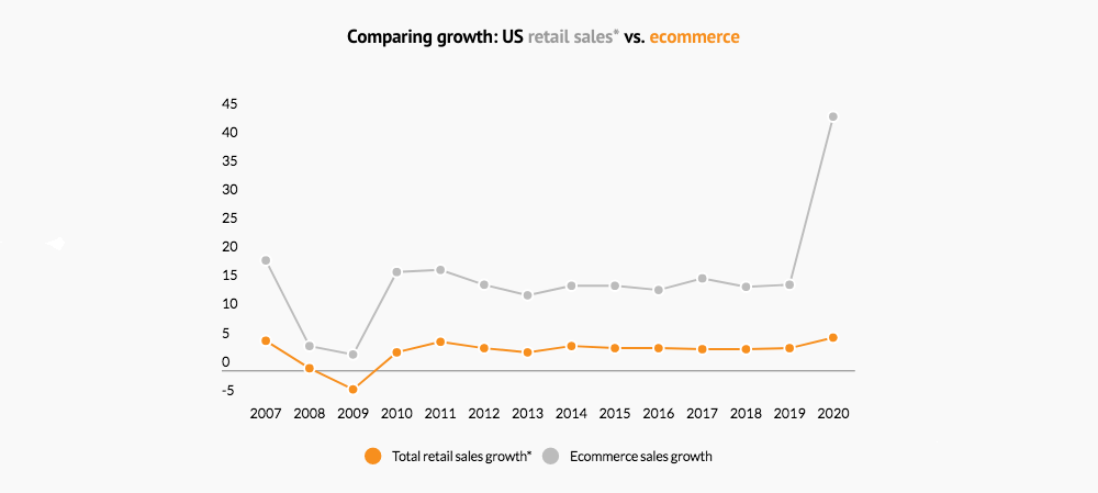 This graph measures growth, not total sales; retail still outweighs ecommerce, and is still growing, despite the decline of the mall. Retail sales in 2000 were $2.98 billion, vs ecommerce sales of $27 billion. In 2019, those figures were $5.41 billion for retail (186% of the 2000 figure), and $578 billion for ecommerce (2,140% of the 2000 figure). These figures are from before the pandemic drove us all indoors and triggered a landslide of ecommerce sales.